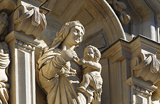 Le dernier niveau est celui que l'on remarque le plus. Il s'agit de la statue de la Vierge à l'Enfant. Au dessus, vous remarquerez une représentation du Père Eternel qui tient un globe et fait un geste de bénédiction.