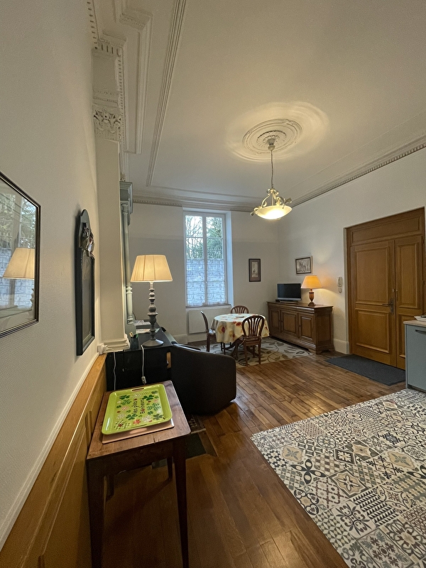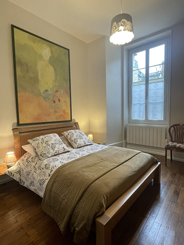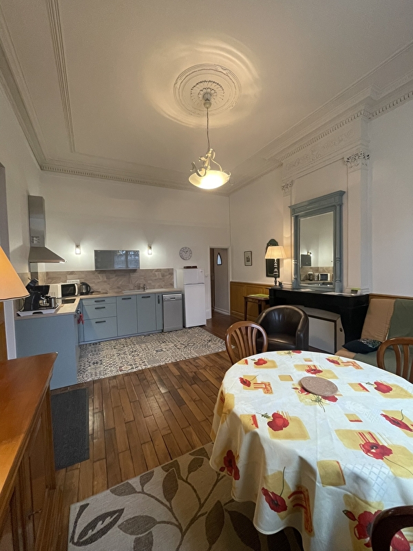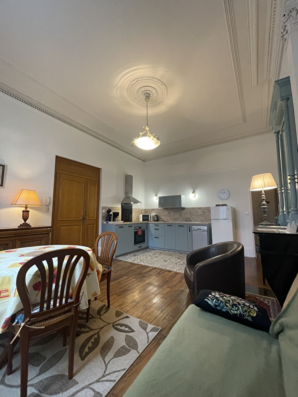 Appartement de 43m² confortablement meublé situé au RDC d’un immeuble calme comprenant : 1 pièce à vivre avec clic-clac, coin repas et cuisine toute équipée : micro-onde, plaque à induction, four, batterie de cuisine. TV, lecteur DVD, clé disponible gratuite pour pressing. Une salle d’eau avec douche et wc. Une chambre avec lit de 140 cm. Possibilité lit bébé. Pour un week-end sans contrainte : Nécessaire pour petit déjeuner offert