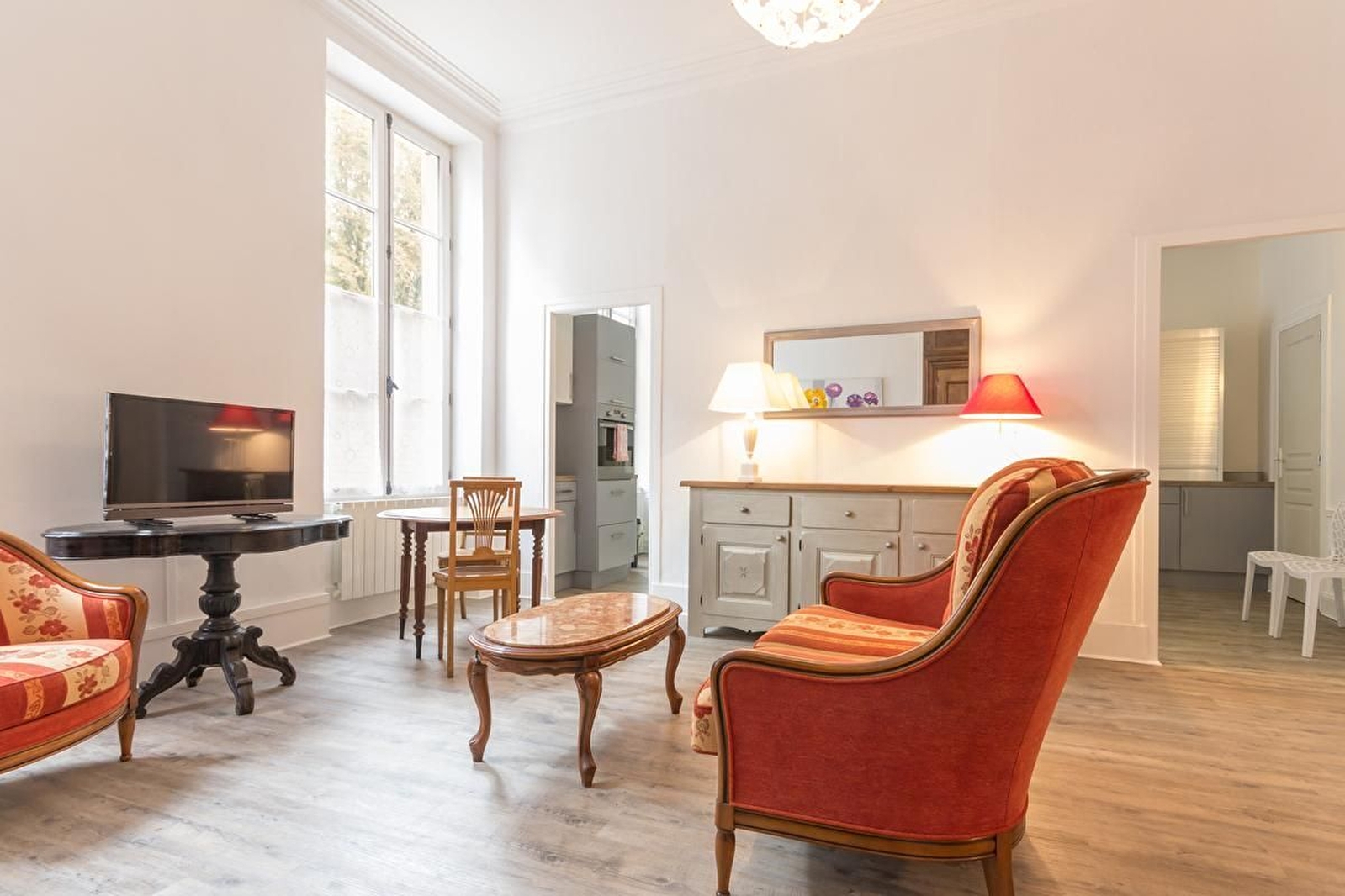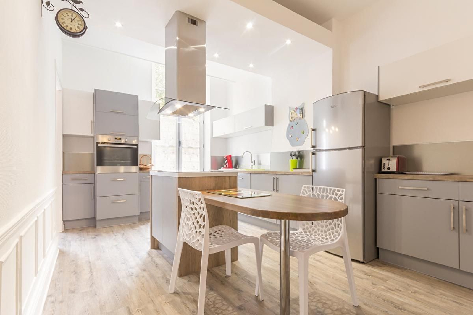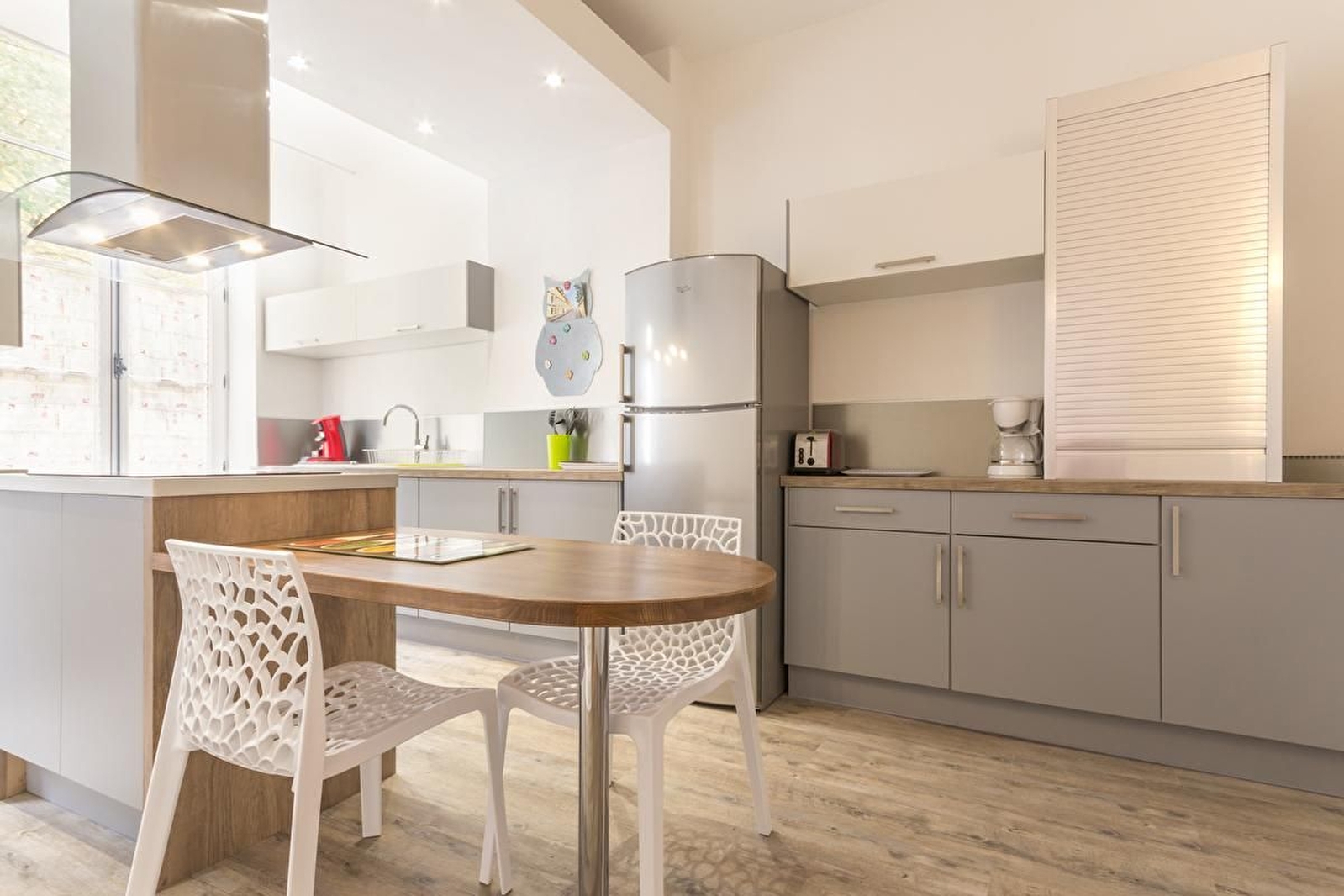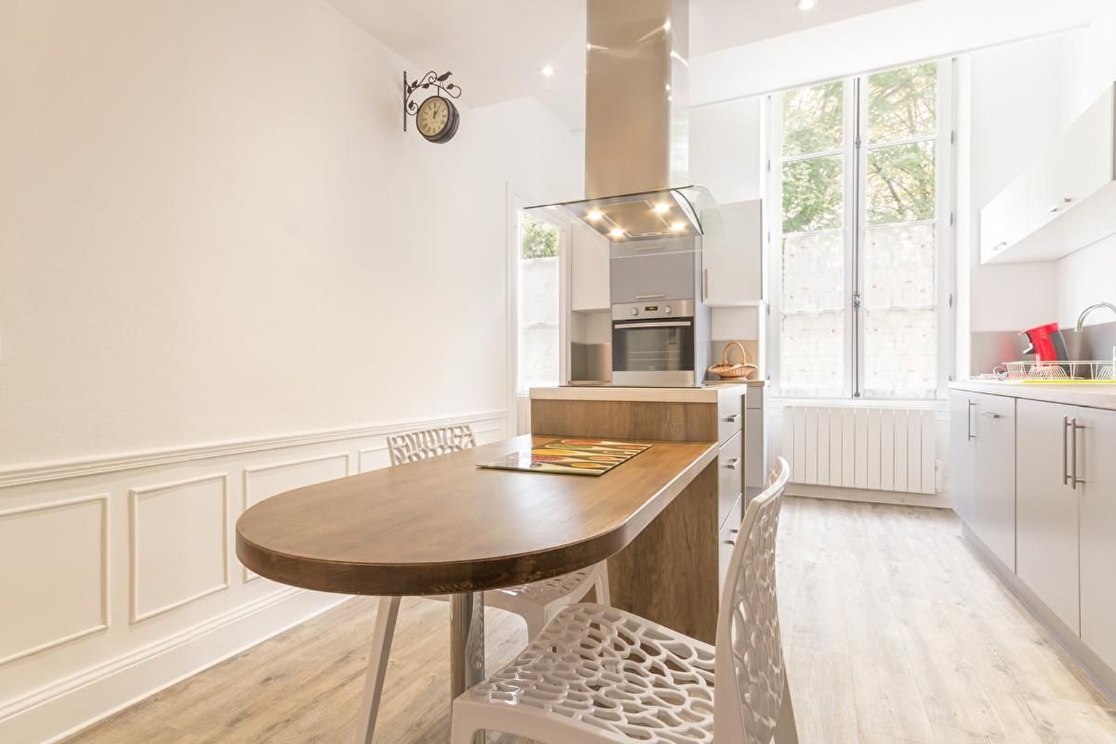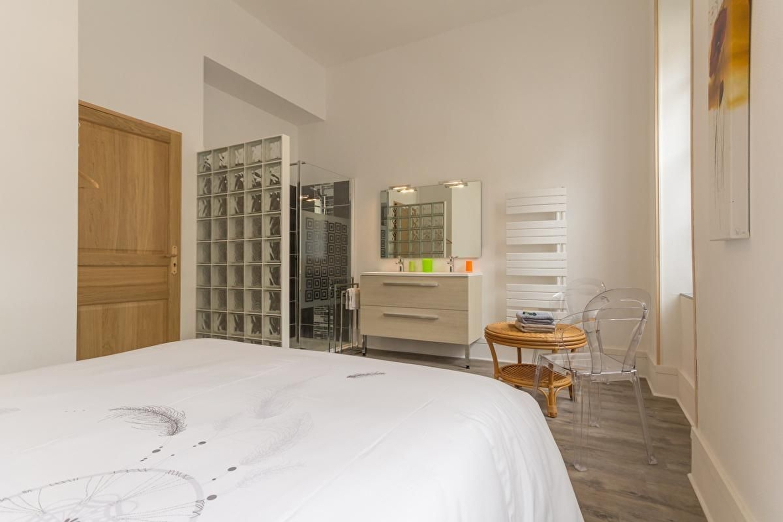 Dans le centre-ville de Nevers, venez séjourner dans un appartement entièrement rénové en rez-de-chaussée d'un immeuble ancien, calme, donnant sur une rue à sens unique en façade et sur une cour à l'arrière. L'appartement comprend 1 cuisine spacieuse équipée et intégrée 1 salon avec télé écran plat, et un bureau 1 chambre avec 1 lit 160x200 et une salle d'eau ouverte sur la chambre avec double vasque et douche à l'italienne grande dimension 1 wc séparé. Possibilité lit bébé et chaise haute à la demande. Linge de toilette fourni , les lits sont faits à l'arrivée et draps fournis. Accès au lave-linge et sèche linge sous conditions. Egalement, 1 place privative dans parking souterrain au bout de la rue.