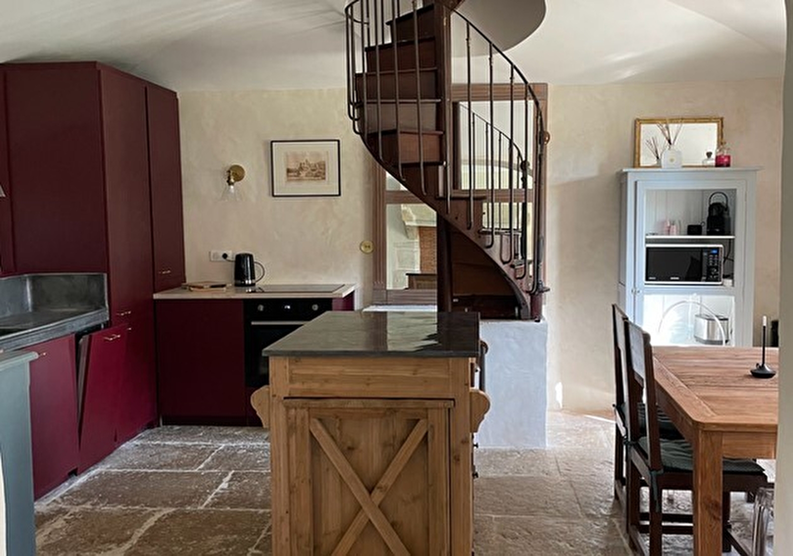 onde, four et plaque de cuisson. Une barbecue est sur la terrasse. 3 lits – 5 couchages.