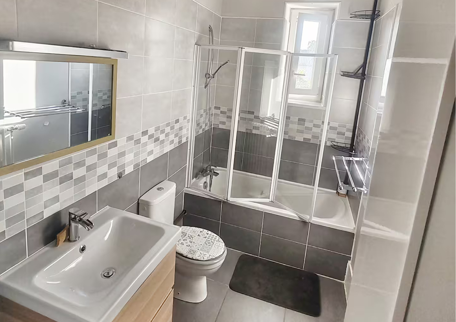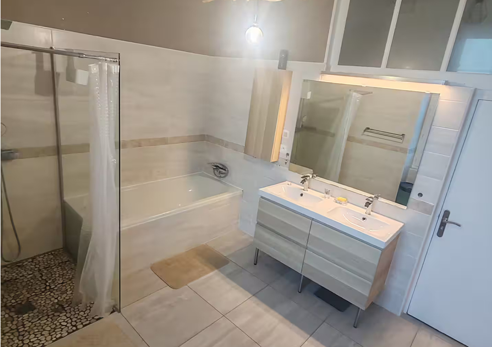 Cuisine entièrement équipée, lave-linge, sèche linge, 2 salles de bain, 1 toilette avec évier.
