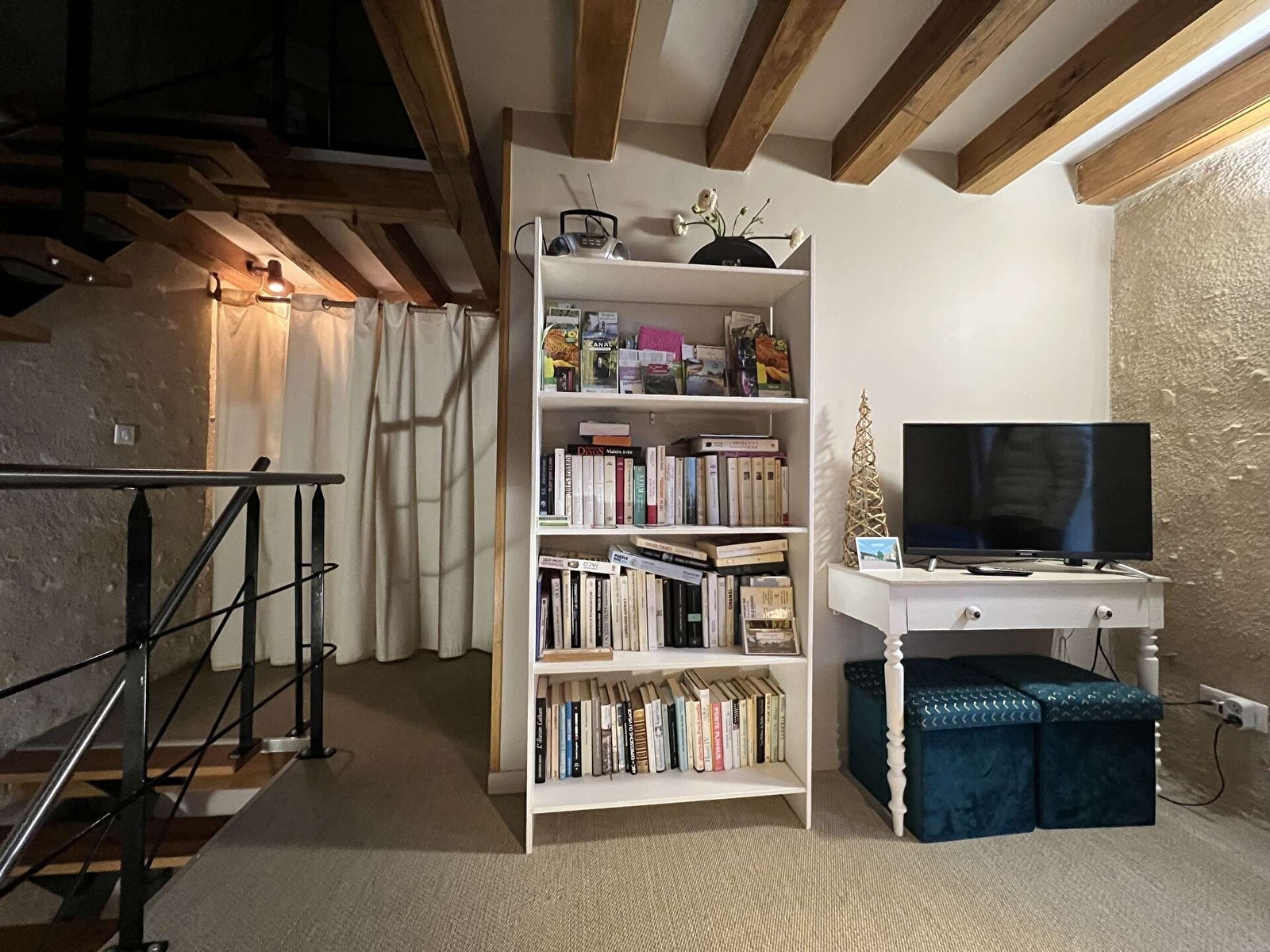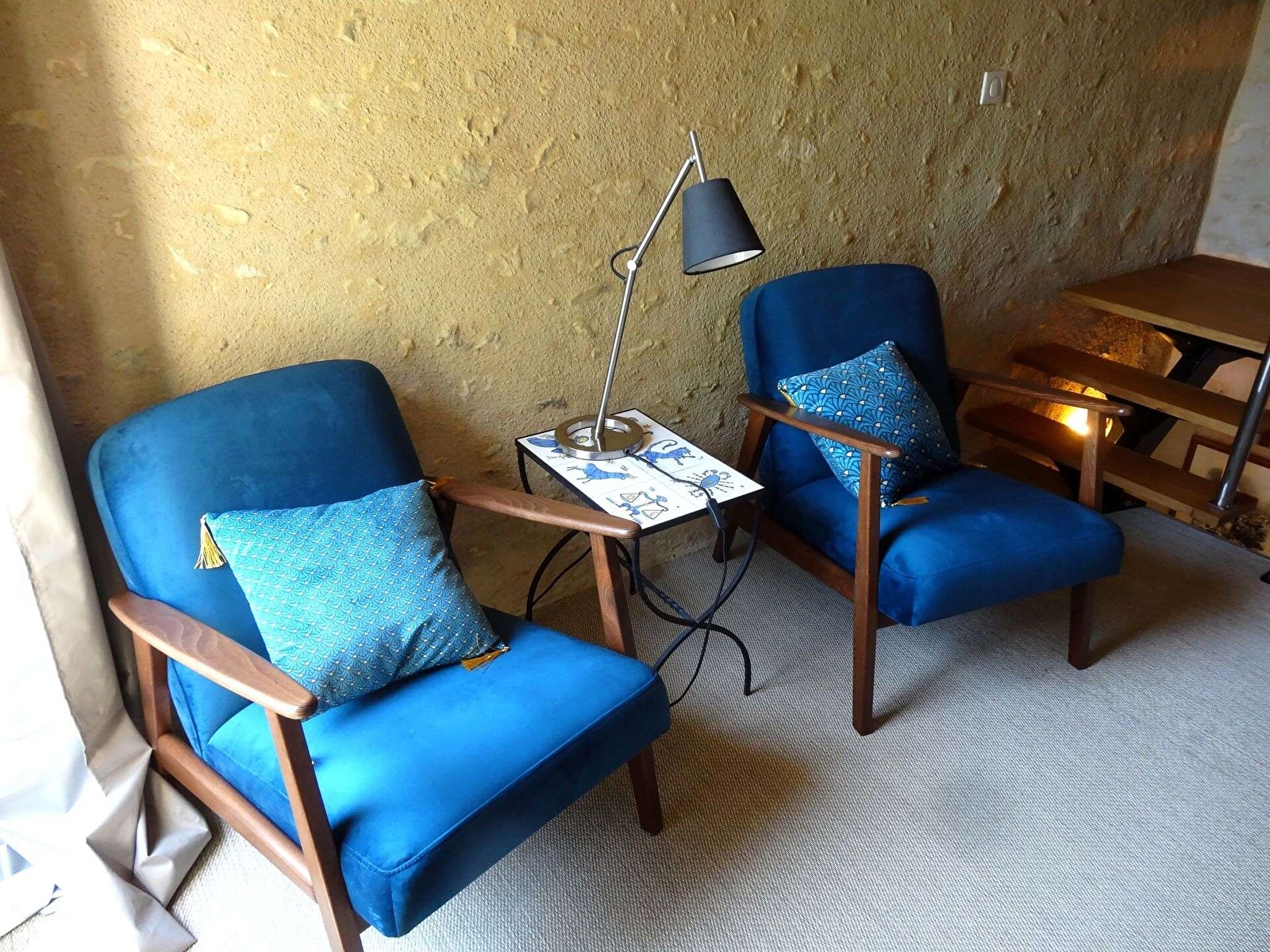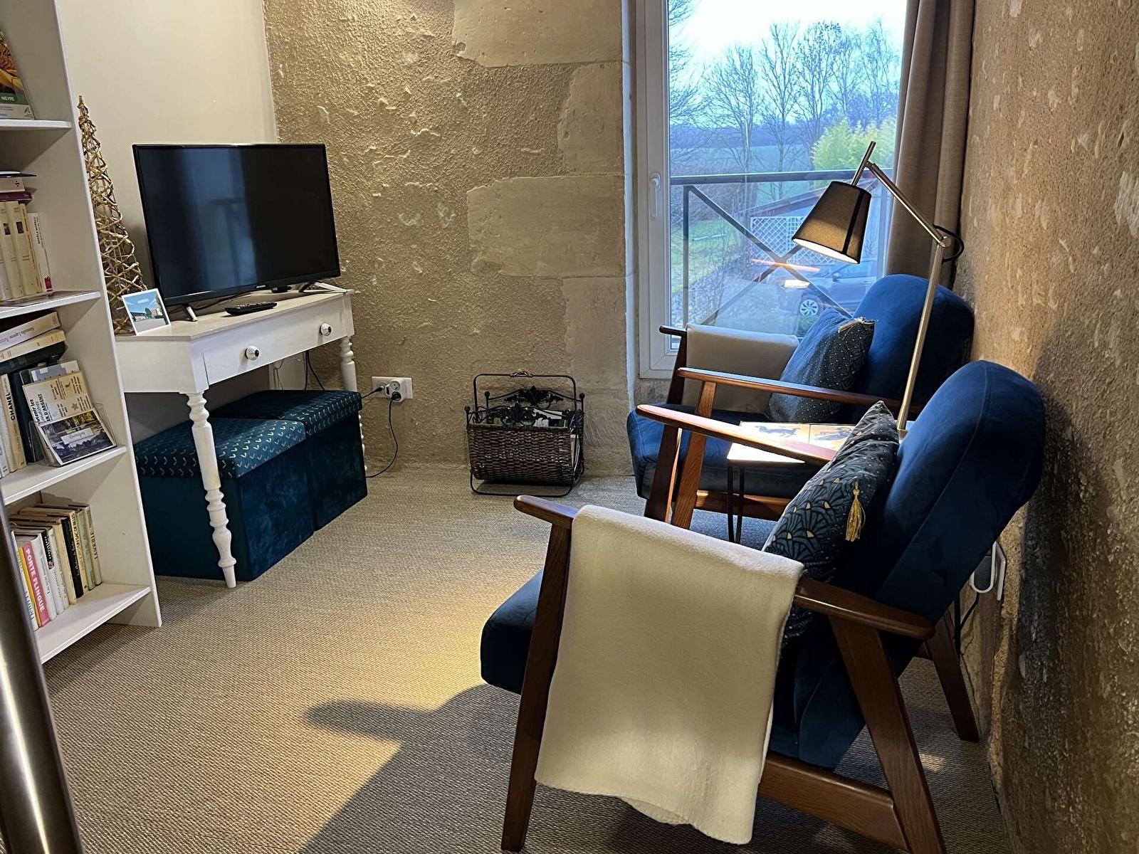 Au 1er étage: le salon composée de 2 fauteuils, télé à écran plat et bibliothèque avec livres et jeux, également une salle d'eau avec une douche grande dimension.