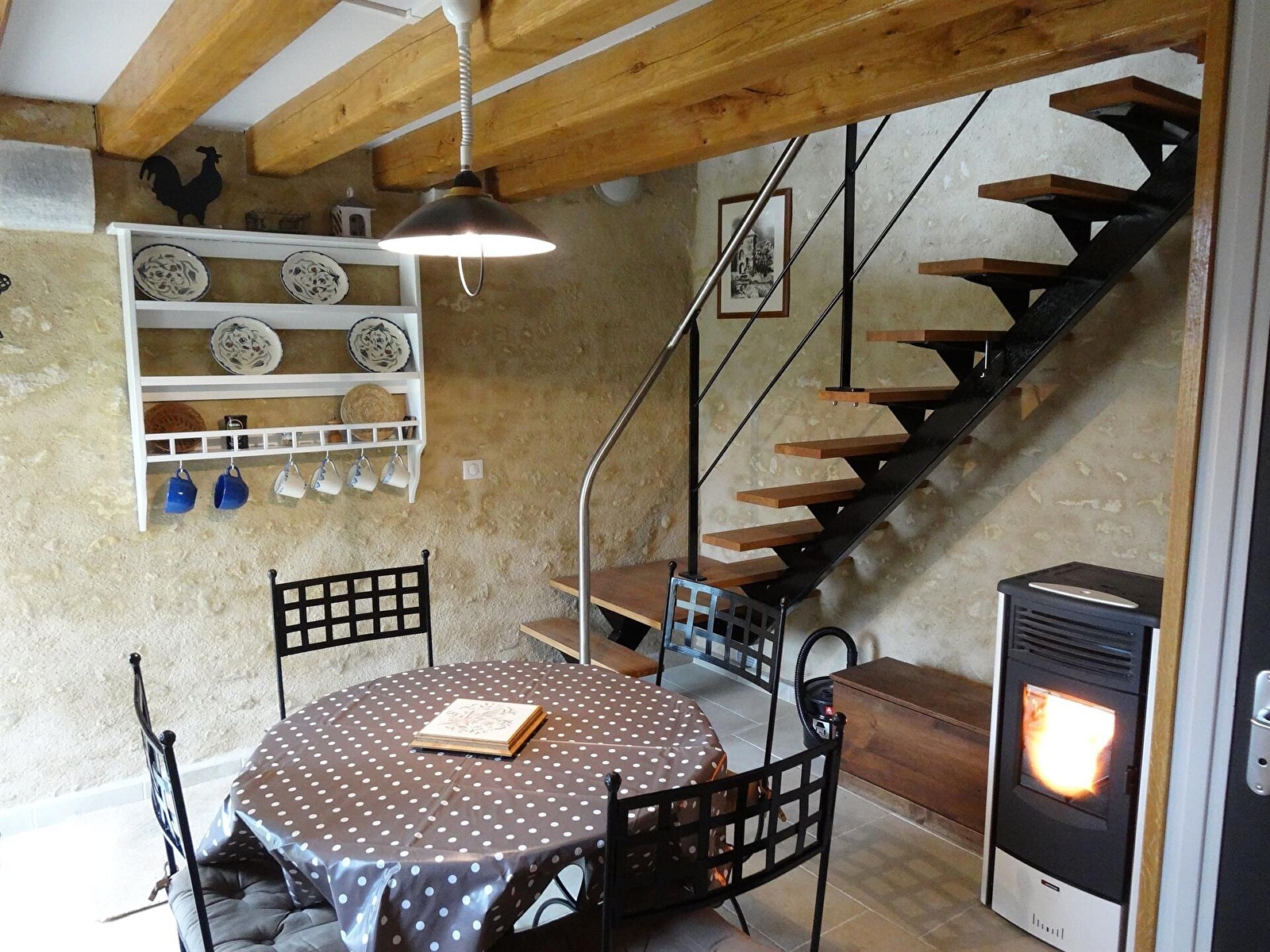 Au rez-de-chaussée : une cuisine équipée avec un poêle à granulés et toilettes.