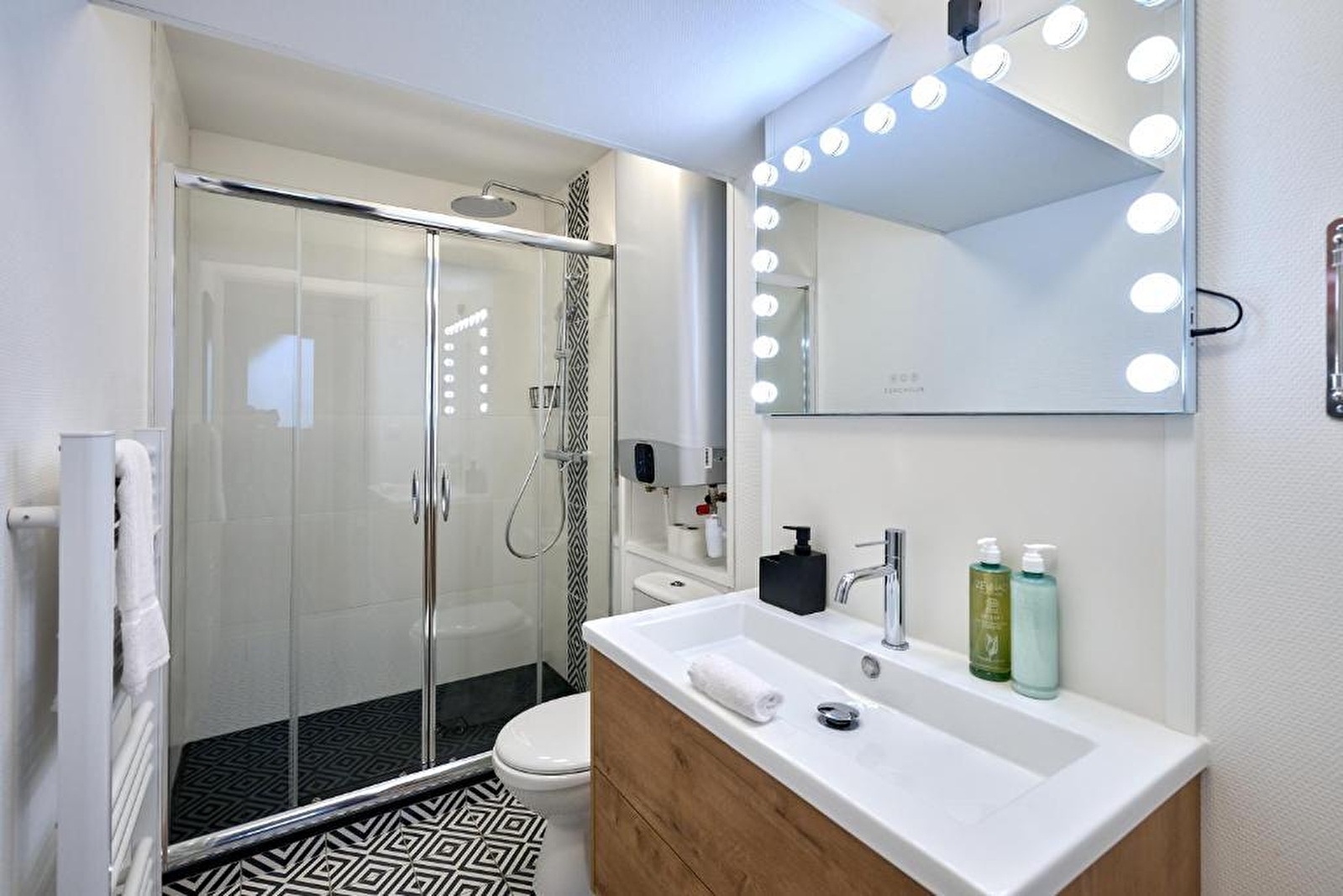Le logement est composé d'un coin salon avec canapé confort, salle d'eau avec douche et wc, meuble vasque et cuisine équipée ouverte avec four, plaques à induction, frigo, lave-vaisselle, micro-ondes, chambre cinéma avec un lit en 160,